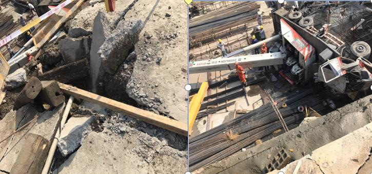 如图,这是一起汽吊在坑边作业时,因支腿处地基下陷造成整机倾覆翻入基坑底的事故。事故前,该汽吊在同一位置已进行了二天的吊装作业.事故时,汽吊未超载.事故后,发现下陷处地面周边有许多裂缝,下陷下的坑壁有水流出现象。左图是支腿处地面下陷情况,右图是汽吊翻入坑底情况。