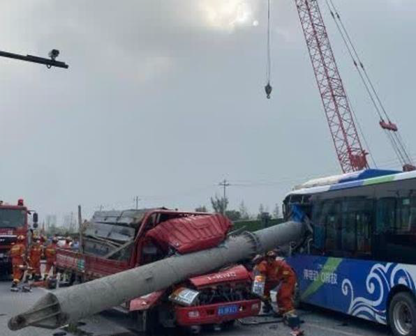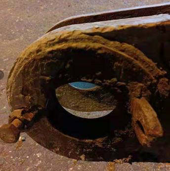 某市地铁工程项目一台三支点步履式打桩架配置三轴钻机进行地基加固施工。突发一根斜支撑倾倒压在马路上正常行驶的汽车上,造成1人死亡。事故后发现用于斜支撑与立柱连接的是一根大销轴,对大销轴起到锁定作用的是横向小销轴,由于小销轴固定部位焊缝开裂脱落造成大销滑出。下图左是事故后现场情况,下图右为小销固定断裂情况。