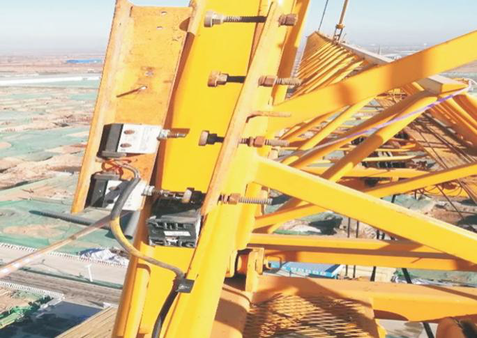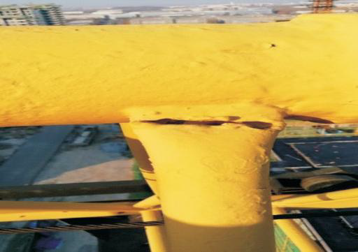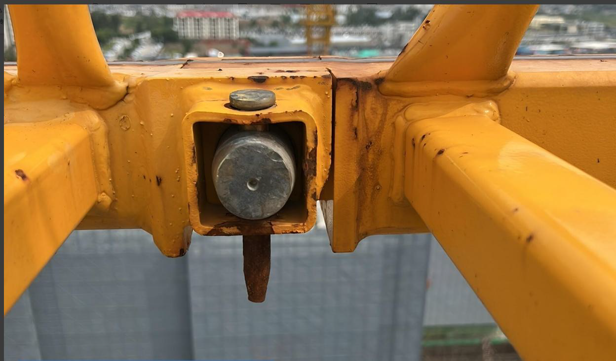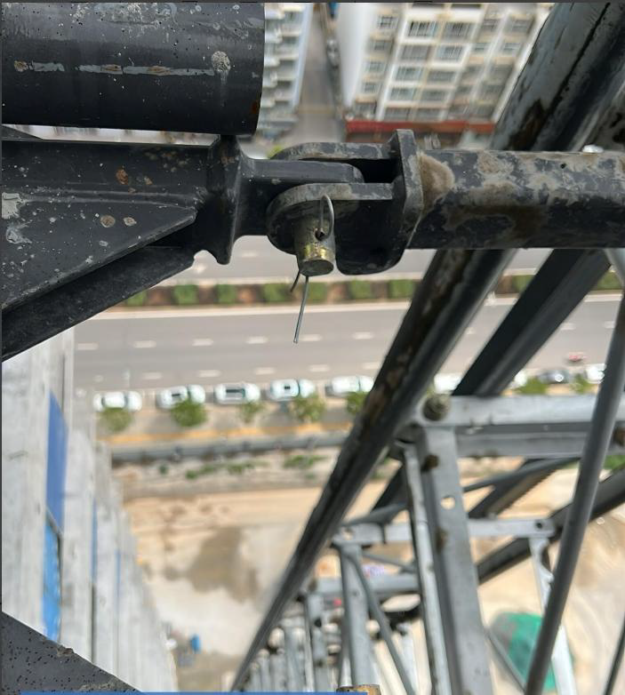 图示塔式起重机扶墙架连接开口销(铁丝替代)符合规定。