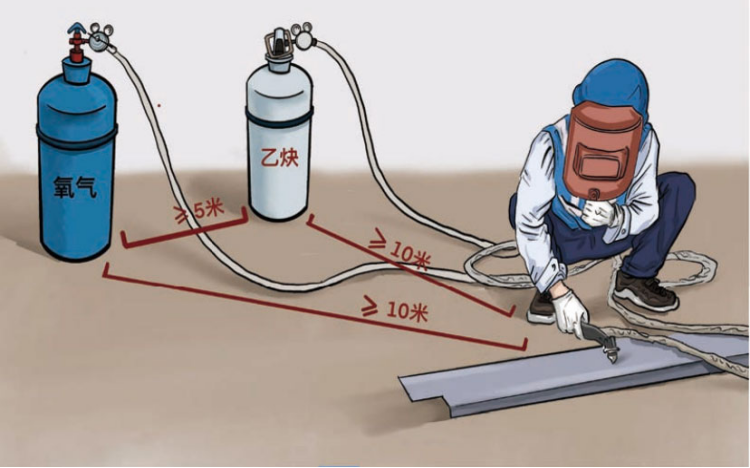 下图中气焊作业氧气乙炔气瓶,和气瓶到动火点的距离是否正确