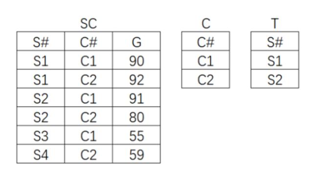 学生选课成绩表关系模式是SC(S#,C#,G),S#为学号,C#为课号,G为成绩,T=πS#,c#,(SC)/C表示()。