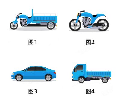 解析:本题主要考察准驾型代号。图1表示普通三轮摩托车D,图2表示轻便摩托车F;图3表示小型汽车C1;图4表示低速载货汽车C3。题目问代号为E的,E表示普通二轮摩托车,准驾轻便摩托车F,因此选择"图2"。