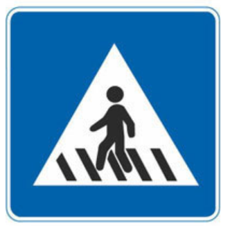相关法规参考:GB5768.2-2022<<道路交通标志和标线第2部分:道路交通标志>>,7.13人行横道标志,表示该处为人行横道,机动车驾驶人应注意观察行人,遇行人已进入人行横道时应停车让行人通过。标志颜色为蓝底、白三角形、黑图形。可在人行横道标志外加10cm宽荧光黄绿的边框,并不应减小人行横道标志的尺寸。设在人行横道两端适当位置,并面向来方向。该标志应与人行横道线同时使用。无信号灯控制的人行横道两端应设置人行横道标志,已设置信号灯、停车让行标志、减速让行标志的路段或路口,可不设此标志。人行横道线不易被驾驶人发现时,可提前设置"注意行人"的警告标志。
