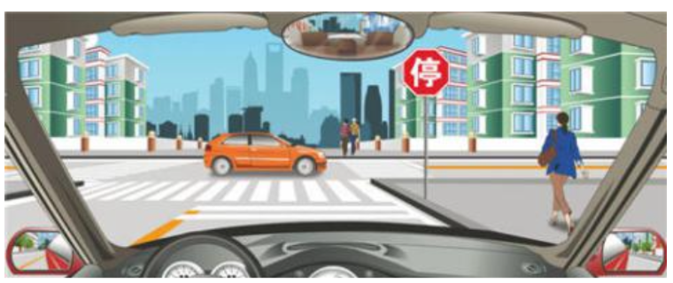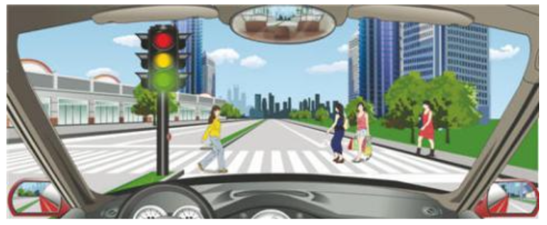 解析:本题主要考察避让行人和非机动车的文明驾驶。如图,前方有行人正在通行,应停车等待行人通过。因此选择"停车等待行人通过"。