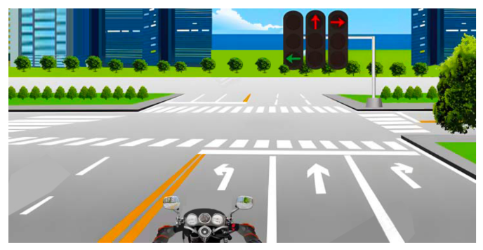 驾驶摩托车通过图中路口场景时,以下正确的说法是什么?