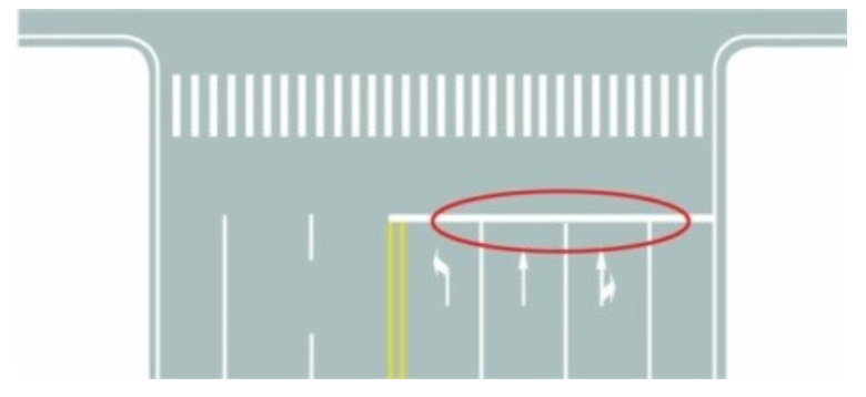 相关法规参考:GB5768.3-2009<<道路交通标志和标线第3部分:道路交通标线>>,5.5停止线,5.5.1表示车辆让行、等候放行等情况下的停位置。5.5.2可施划于交叉路口、铁路平交道口、左弯待转区的前端、人行横道线前及其他需要辆停止的位置。5.5.3停止线为白色实线。双向行驶的路口,停止线应与对向车行道分界线连接;单向行驶的路口,其长度应横跨整个路面。