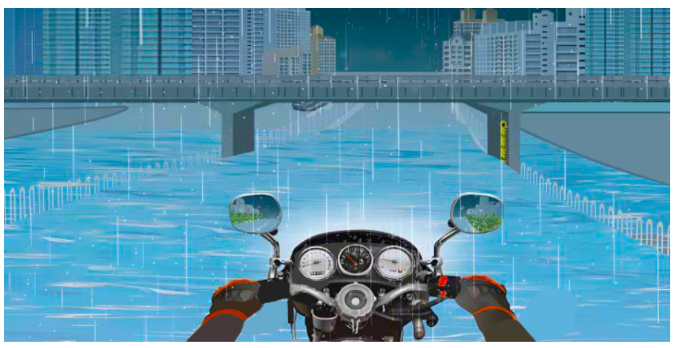 驾驶摩托车遇桥下积水较深要绕行。