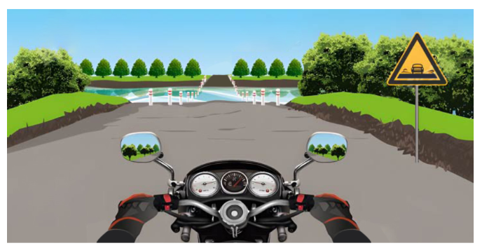 第330题 驾驶摩托车通过桥梁路段前,为避免桥头"跳车",车辆颠簸,要提前降低速,谨慎驶入。