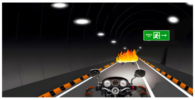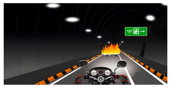 在隧道内驾驶摩托车,遇前方发生火灾时,可以继续前行并绕行通过。