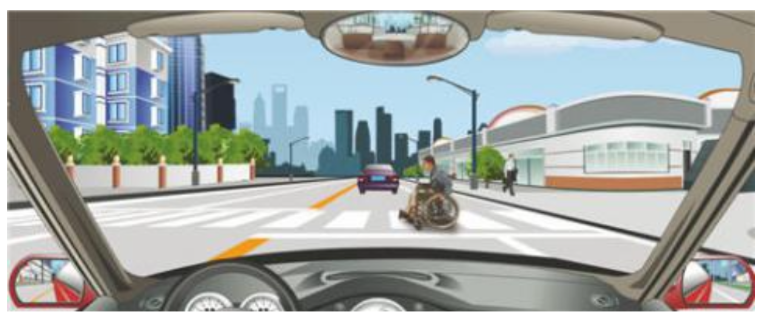解析:本题主要考察避让行人和非机动车的文明驾驶。有残疾人正在过马路,应文明礼让,主动停让行。因此选择"主动停礼让"。