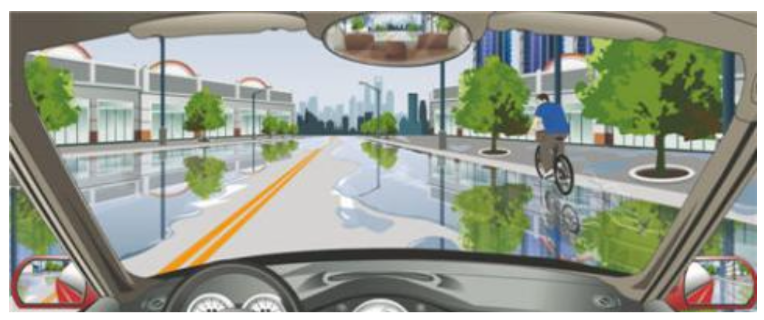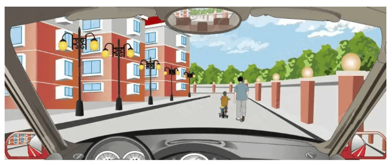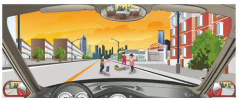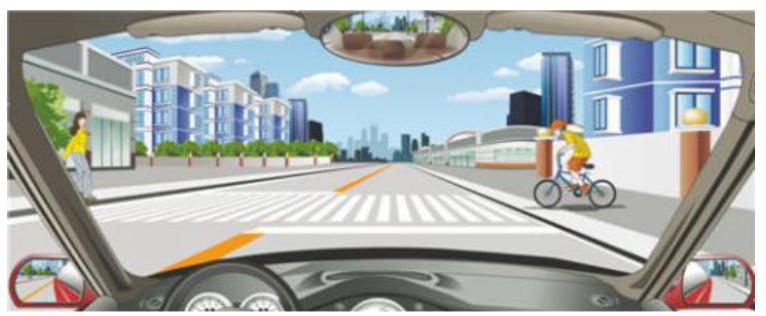 解析:本题主要考察避让行人和非机动车的文明驾驶。图中右前方有小孩正在骑,正准备通过人行横道,驾驶机动车应减速让行。因此选择"主动减速让行"。