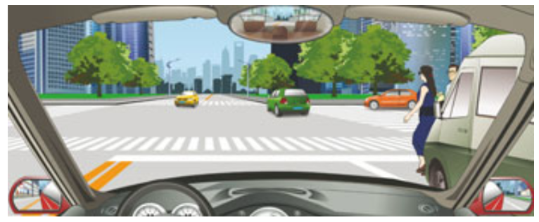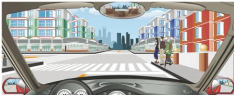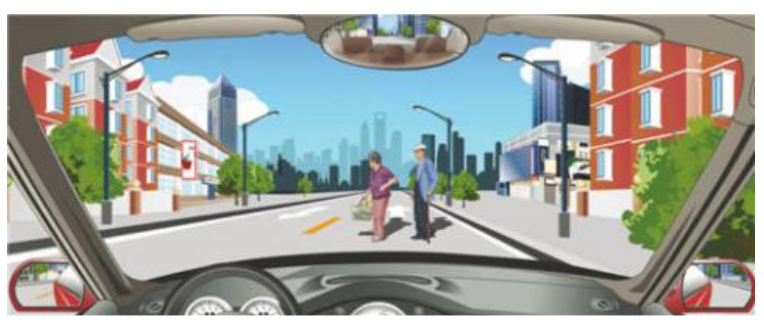 解析:本题主要考察避让行人和非机动车的文明驾驶。虽然横穿道路的行人算乱穿,但面对这样的情况驾驶员依旧要减速慢行,必要时停避让,因此选择"及时减速停让行"。