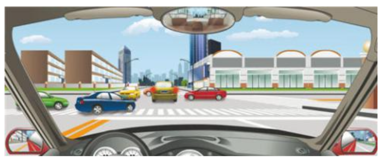 解析:本题主要考察缓行、拥堵路段或路口的通行规定。图中前方虽是绿灯,但路口内仍然拥堵,不能进入路口和网状线,只能在路口外等待。因此选择"停在路口以外等待"。