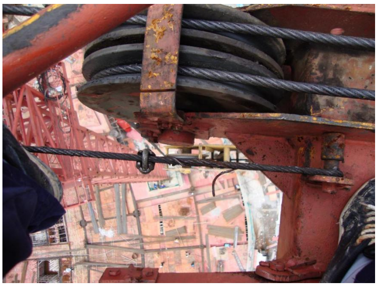 下图是起升钢丝绳跳槽后,与小车架体发生摩擦,最终因快速磨损而断裂,下列哪些做法是正确的?()