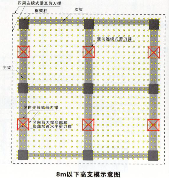下图是8m以下满堂模板和共享空间模板支架的剪刀撑示意图,下面关于模板支架剪刀撑设置描述正确的是:()