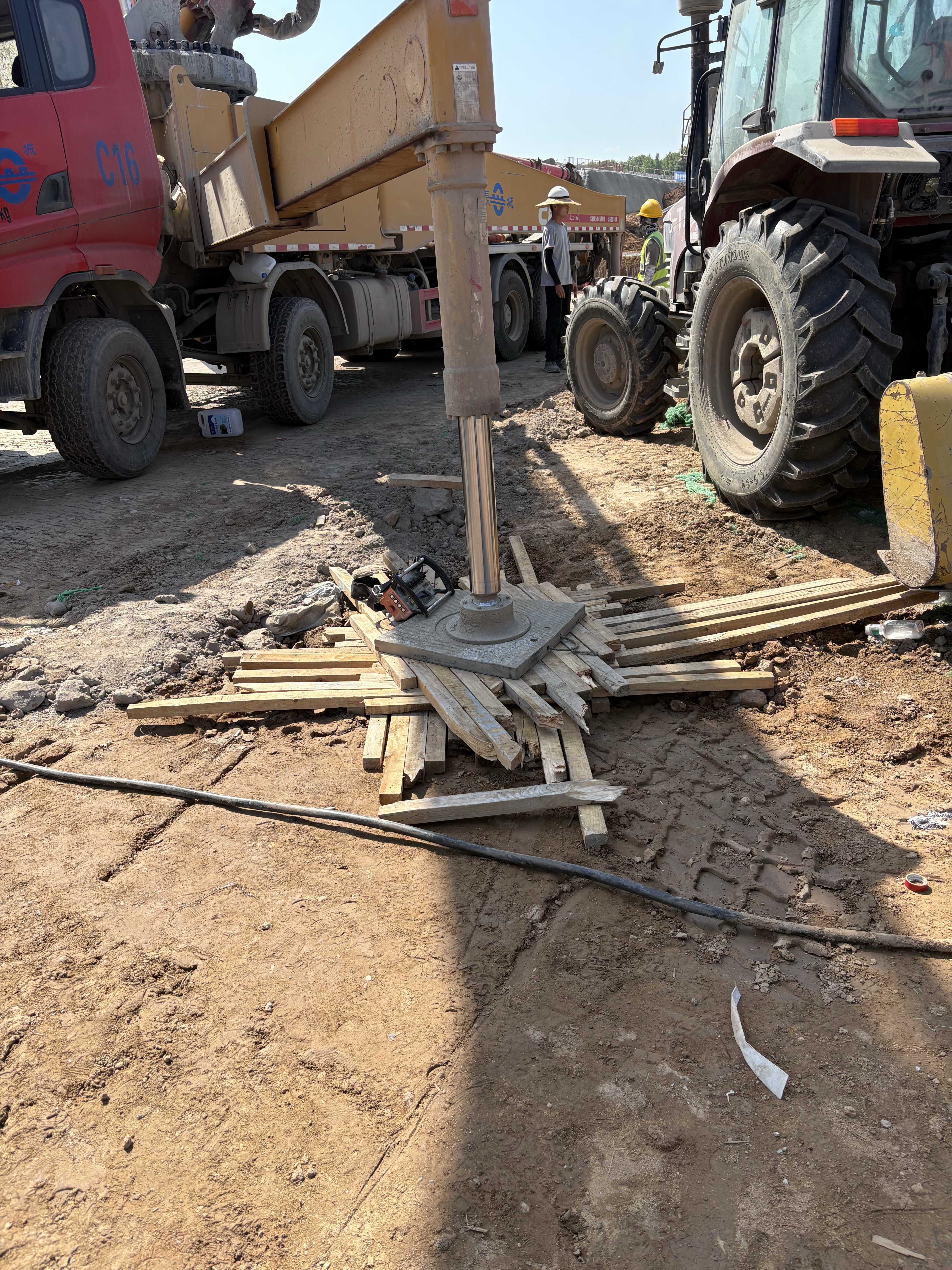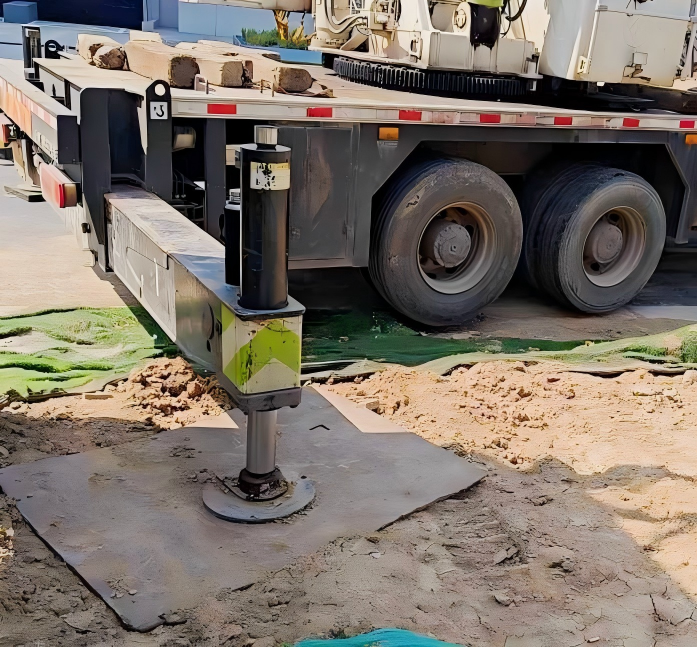 B.支腿下方地面为松软泥土,未进行硬化或夯实处理,承载力不足,存在支腿下陷风险
