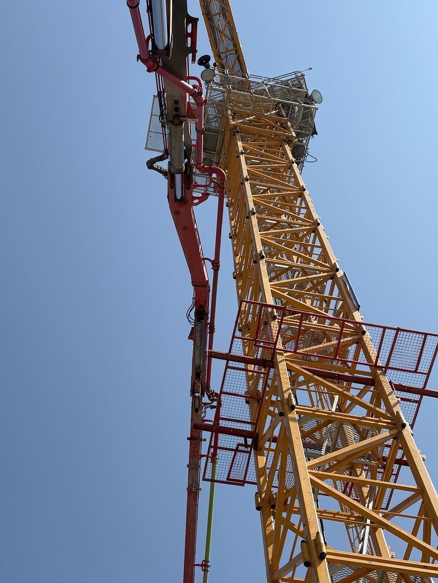 A.混凝土泵车臂架与塔式起重机塔身安全距离不足,存在碰撞风险