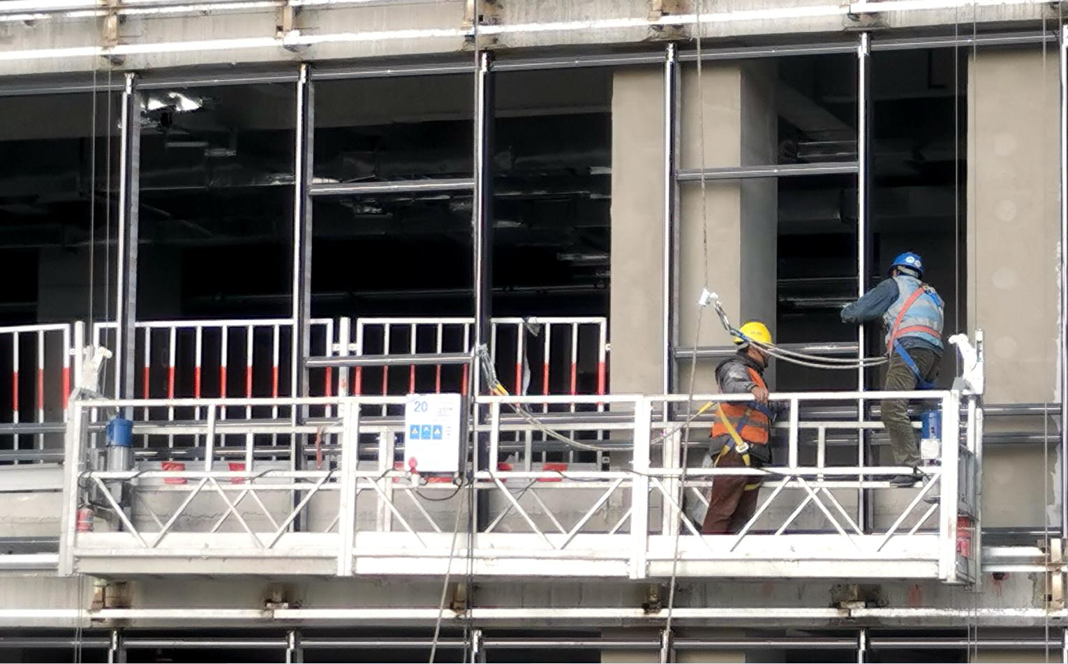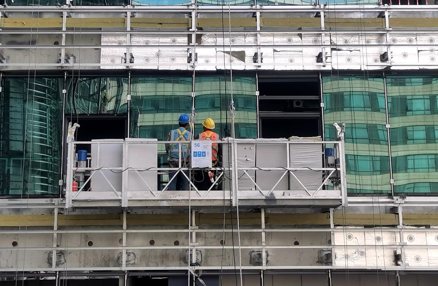 第341题 图示高处作业吊篮操作人员应在地面进出悬吊平台,不得在空中攀缘窗口出入,严禁作业人员从一悬吊平台跨入另一悬吊平台。( )