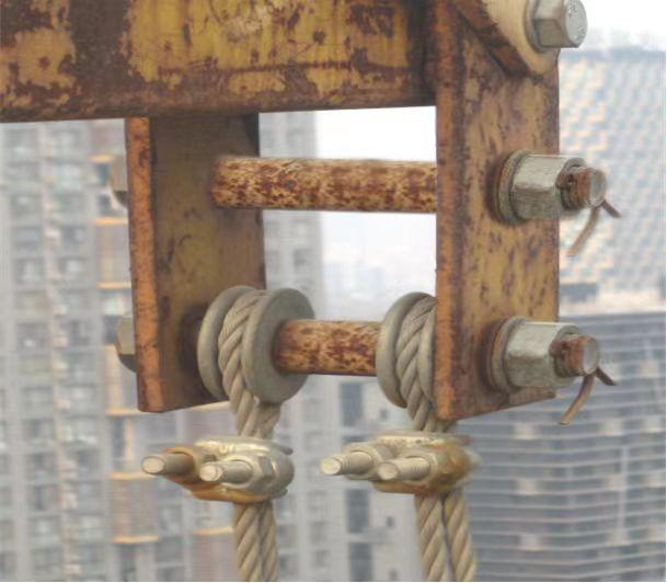第351题 图示高处作业吊篮工作钢丝绳与安全钢丝绳安装在悬挂机构横梁前端同一悬挂点上不影响使用。( )