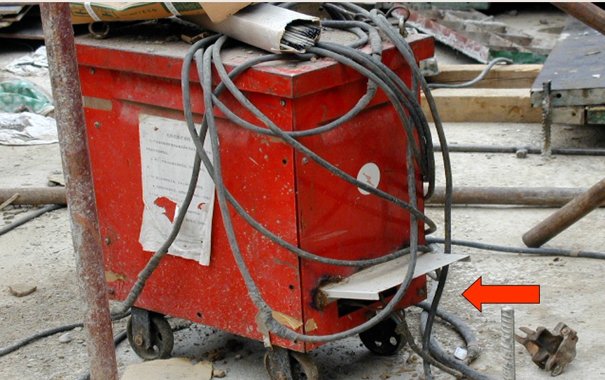 A.电焊机电源侧接线端防护罩未按照要求设置