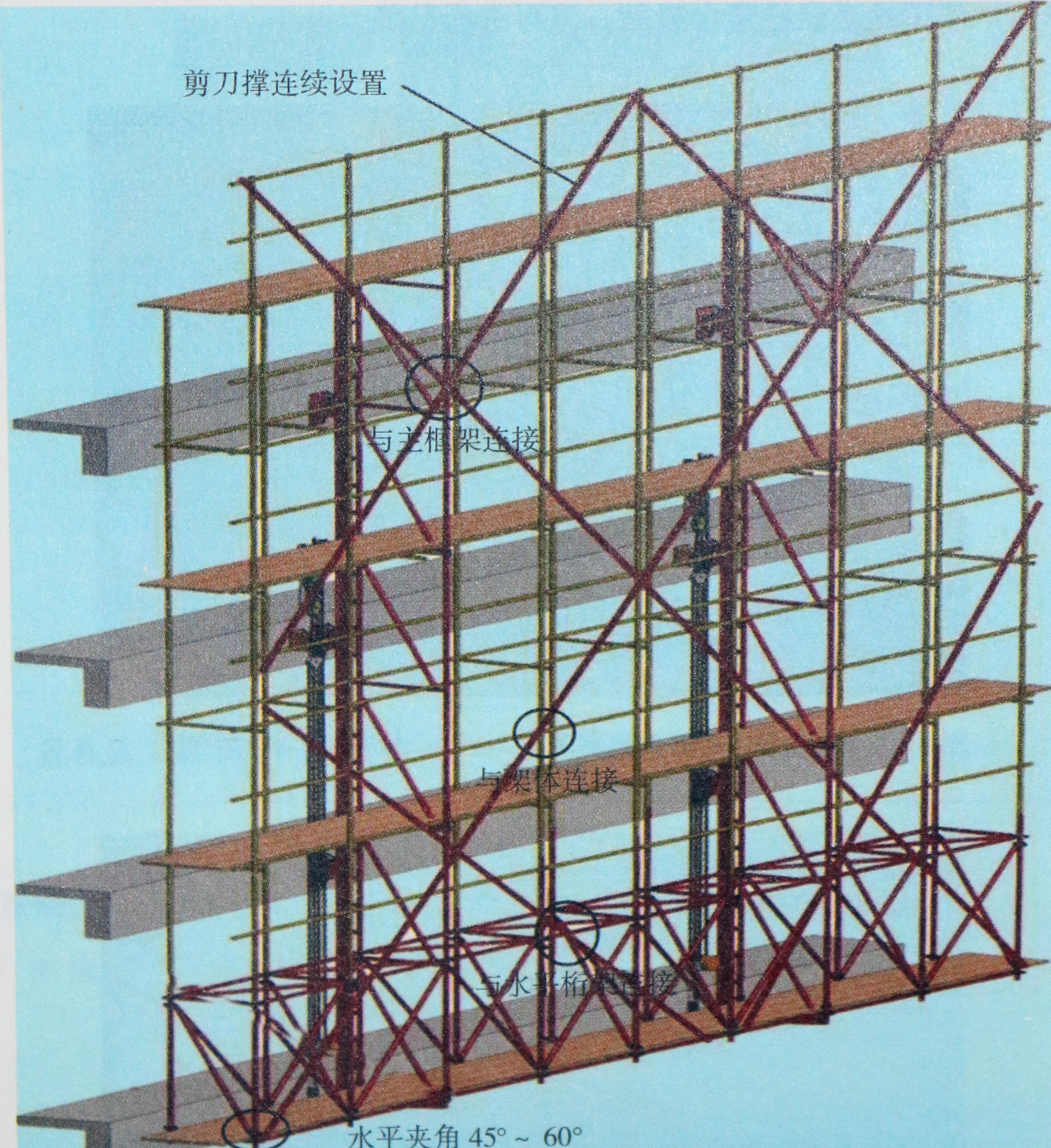 第3570题 据图所示,剪刀撑应沿架体高度连续设置,并应将竖向主框架、水平支承桁架和架体构件连成一体,剪刀撑斜杆水平夹角应为( )。