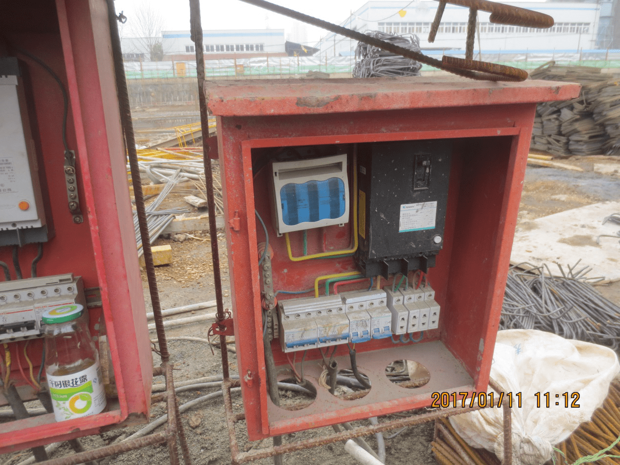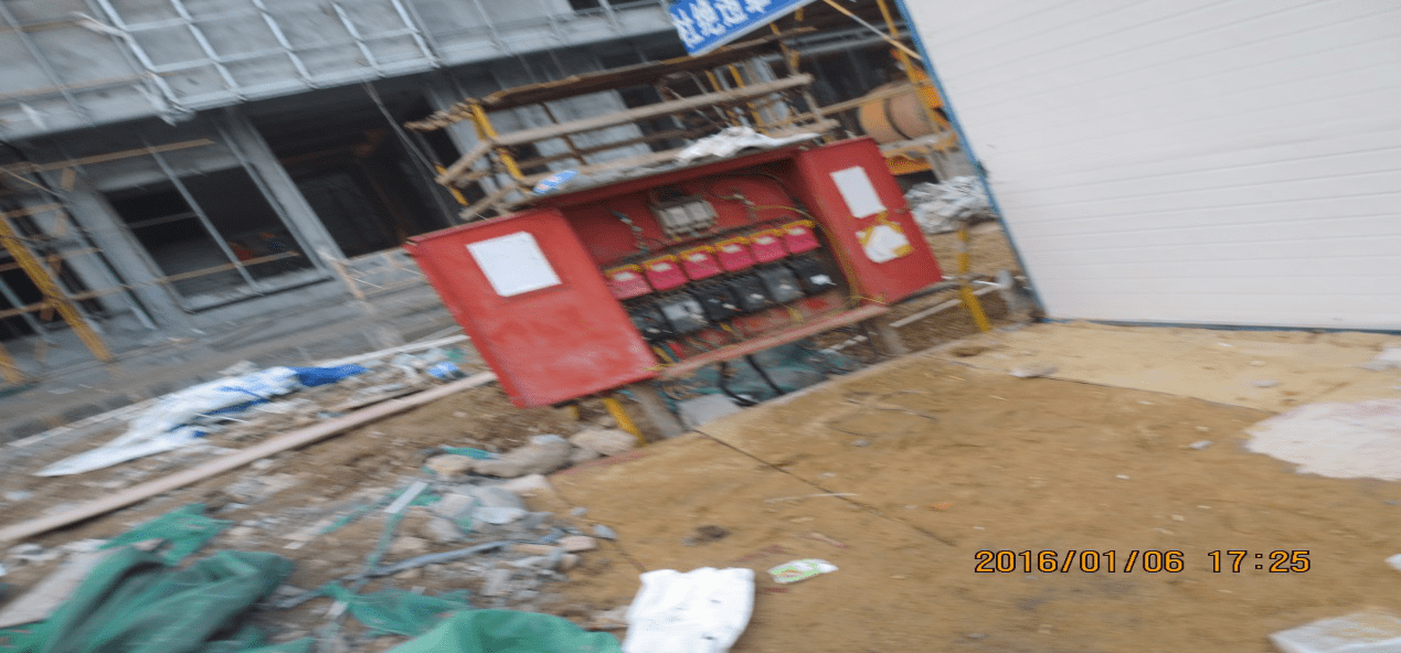 第3804题 关于下图隐患中,配电箱高度不符合规范要求;规范要求,配电箱、开关箱应装设端正、牢固。固定式箱体中心点与地面垂直距离为( )。