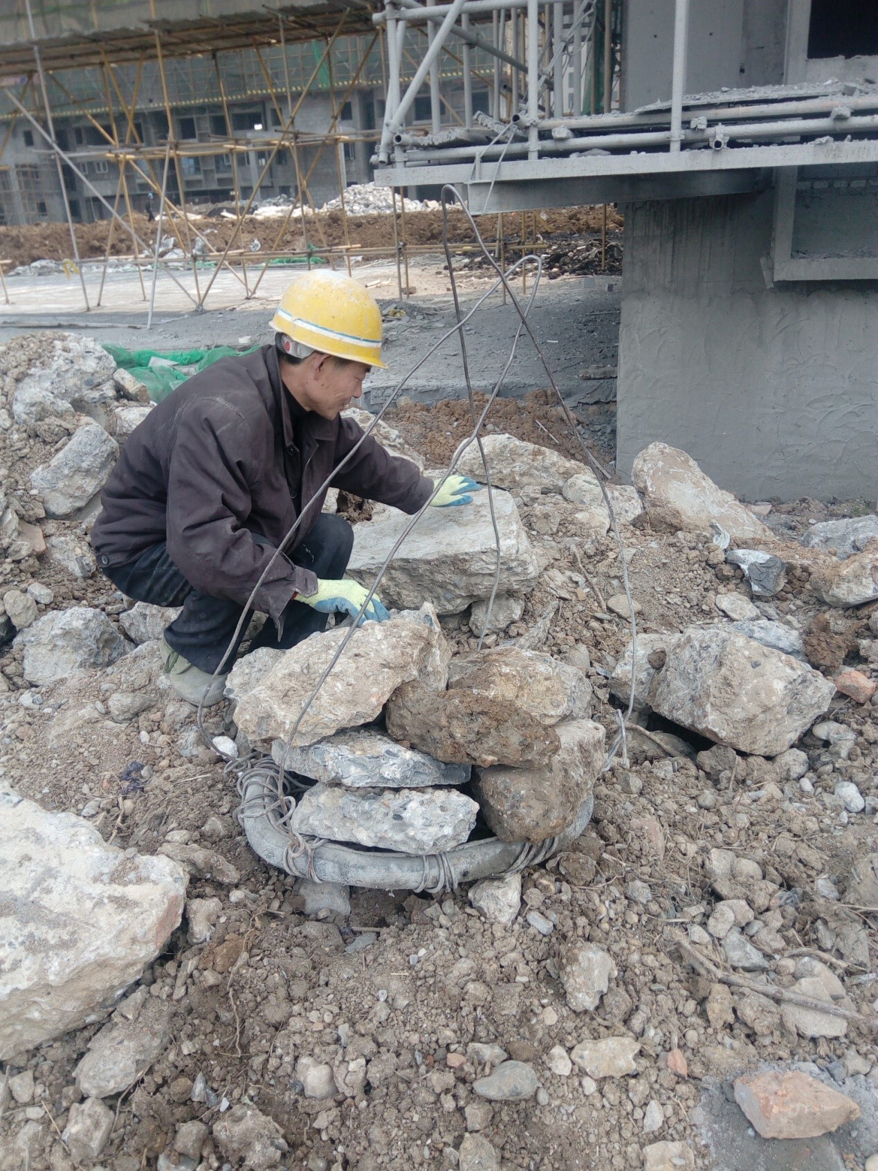 第3925题 图中显示某工地正在用塔机吊运零星石块,存在的违规情况有( )。