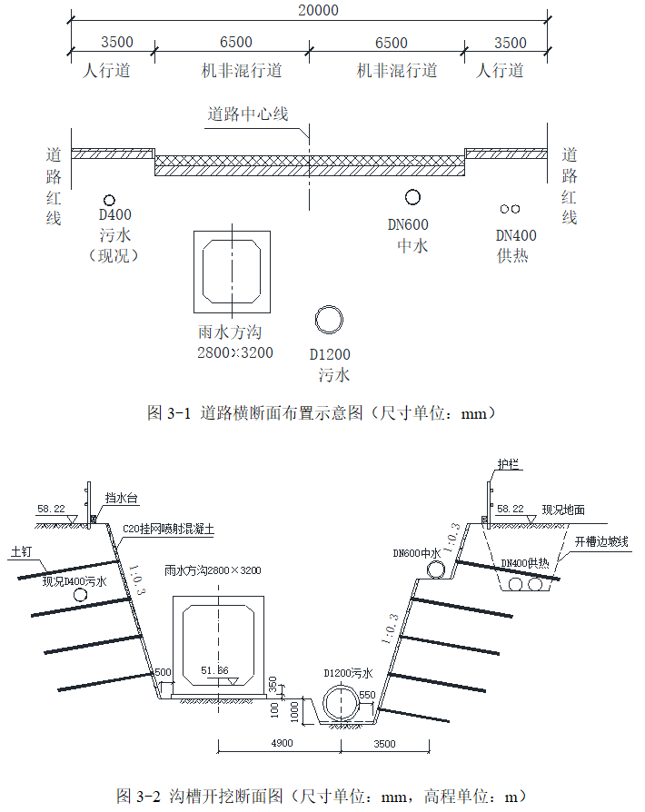 1.总体施工顺序中名称:A:D1200污水管道,B:DN400供热管道,C:人行道。